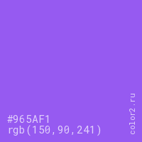 Цвет #965AF1 в цветовой модели RGB обозначается тремя октетами (150, 90, 241) в десятичном формате и #965AF1 в шестнадцатиричном (hex) формате, которые являются интенсивностью красного 150 (hex 96), интенсивность зелёного 90 (hex 5A) и интенсивность синего 241 (hex F1).