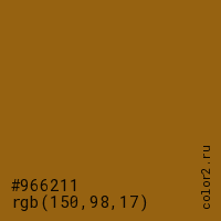 Цвет #966211 в цветовой модели RGB обозначается тремя октетами (150, 98, 17) в десятичном формате и #966211 в шестнадцатиричном (hex) формате, которые являются интенсивностью красного 150 (hex 96), интенсивность зелёного 98 (hex 62) и интенсивность синего 17 (hex 11).