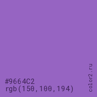 Цвет #9664C2 в цветовой модели RGB обозначается тремя октетами (150, 100, 194) в десятичном формате и #9664C2 в шестнадцатиричном (hex) формате, которые являются интенсивностью красного 150 (hex 96), интенсивность зелёного 100 (hex 64) и интенсивность синего 194 (hex C2).