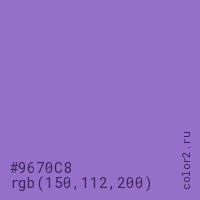 Цвет #9670C8 в цветовой модели RGB обозначается тремя октетами (150, 112, 200) в десятичном формате и #9670C8 в шестнадцатиричном (hex) формате, которые являются интенсивностью красного 150 (hex 96), интенсивность зелёного 112 (hex 70) и интенсивность синего 200 (hex C8).