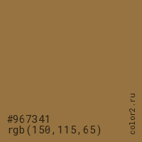 Цвет #967341 в цветовой модели RGB обозначается тремя октетами (150, 115, 65) в десятичном формате и #967341 в шестнадцатиричном (hex) формате, которые являются интенсивностью красного 150 (hex 96), интенсивность зелёного 115 (hex 73) и интенсивность синего 65 (hex 41).