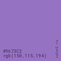 Цвет #9673C2 в цветовой модели RGB обозначается тремя октетами (150, 115, 194) в десятичном формате и #9673C2 в шестнадцатиричном (hex) формате, которые являются интенсивностью красного 150 (hex 96), интенсивность зелёного 115 (hex 73) и интенсивность синего 194 (hex C2).