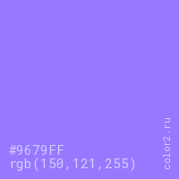 Цвет #9679FF в цветовой модели RGB обозначается тремя октетами (150, 121, 255) в десятичном формате и #9679FF в шестнадцатиричном (hex) формате, которые являются интенсивностью красного 150 (hex 96), интенсивность зелёного 121 (hex 79) и интенсивность синего 255 (hex FF).