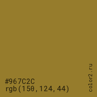 Цвет #967C2C в цветовой модели RGB обозначается тремя октетами (150, 124, 44) в десятичном формате и #967C2C в шестнадцатиричном (hex) формате, которые являются интенсивностью красного 150 (hex 96), интенсивность зелёного 124 (hex 7C) и интенсивность синего 44 (hex 2C).
