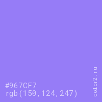 Цвет #967CF7 в цветовой модели RGB обозначается тремя октетами (150, 124, 247) в десятичном формате и #967CF7 в шестнадцатиричном (hex) формате, которые являются интенсивностью красного 150 (hex 96), интенсивность зелёного 124 (hex 7C) и интенсивность синего 247 (hex F7).