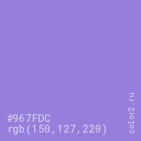 Цвет #967FDC в цветовой модели RGB обозначается тремя октетами (150, 127, 220) в десятичном формате и #967FDC в шестнадцатиричном (hex) формате, которые являются интенсивностью красного 150 (hex 96), интенсивность зелёного 127 (hex 7F) и интенсивность синего 220 (hex DC).