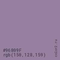 Цвет #96809F в цветовой модели RGB обозначается тремя октетами (150, 128, 159) в десятичном формате и #96809F в шестнадцатиричном (hex) формате, которые являются интенсивностью красного 150 (hex 96), интенсивность зелёного 128 (hex 80) и интенсивность синего 159 (hex 9F).
