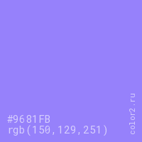 Цвет #9681FB в цветовой модели RGB обозначается тремя октетами (150, 129, 251) в десятичном формате и #9681FB в шестнадцатиричном (hex) формате, которые являются интенсивностью красного 150 (hex 96), интенсивность зелёного 129 (hex 81) и интенсивность синего 251 (hex FB).