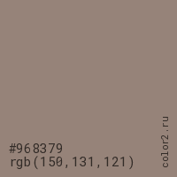 Цвет #968379 в цветовой модели RGB обозначается тремя октетами (150, 131, 121) в десятичном формате и #968379 в шестнадцатиричном (hex) формате, которые являются интенсивностью красного 150 (hex 96), интенсивность зелёного 131 (hex 83) и интенсивность синего 121 (hex 79).