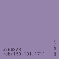 Цвет #9683AB в цветовой модели RGB обозначается тремя октетами (150, 131, 171) в десятичном формате и #9683AB в шестнадцатиричном (hex) формате, которые являются интенсивностью красного 150 (hex 96), интенсивность зелёного 131 (hex 83) и интенсивность синего 171 (hex AB).