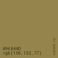Цвет #96844D в цветовой модели RGB обозначается тремя октетами (150, 132, 77) в десятичном формате и #96844D в шестнадцатиричном (hex) формате, которые являются интенсивностью красного 150 (hex 96), интенсивность зелёного 132 (hex 84) и интенсивность синего 77 (hex 4D).
