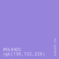 Цвет #9684DC в цветовой модели RGB обозначается тремя октетами (150, 132, 220) в десятичном формате и #9684DC в шестнадцатиричном (hex) формате, которые являются интенсивностью красного 150 (hex 96), интенсивность зелёного 132 (hex 84) и интенсивность синего 220 (hex DC).