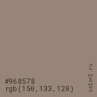 Цвет #968578 в цветовой модели RGB обозначается тремя октетами (150, 133, 120) в десятичном формате и #968578 в шестнадцатиричном (hex) формате, которые являются интенсивностью красного 150 (hex 96), интенсивность зелёного 133 (hex 85) и интенсивность синего 120 (hex 78).