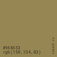 Цвет #968653 в цветовой модели RGB обозначается тремя октетами (150, 134, 83) в десятичном формате и #968653 в шестнадцатиричном (hex) формате, которые являются интенсивностью красного 150 (hex 96), интенсивность зелёного 134 (hex 86) и интенсивность синего 83 (hex 53).