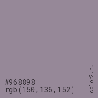 Цвет #968898 в цветовой модели RGB обозначается тремя октетами (150, 136, 152) в десятичном формате и #968898 в шестнадцатиричном (hex) формате, которые являются интенсивностью красного 150 (hex 96), интенсивность зелёного 136 (hex 88) и интенсивность синего 152 (hex 98).