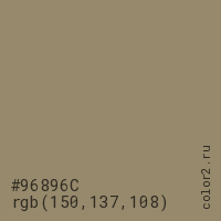 Цвет #96896C в цветовой модели RGB обозначается тремя октетами (150, 137, 108) в десятичном формате и #96896C в шестнадцатиричном (hex) формате, которые являются интенсивностью красного 150 (hex 96), интенсивность зелёного 137 (hex 89) и интенсивность синего 108 (hex 6C).