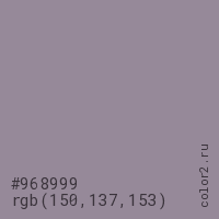 Цвет #968999 в цветовой модели RGB обозначается тремя октетами (150, 137, 153) в десятичном формате и #968999 в шестнадцатиричном (hex) формате, которые являются интенсивностью красного 150 (hex 96), интенсивность зелёного 137 (hex 89) и интенсивность синего 153 (hex 99).