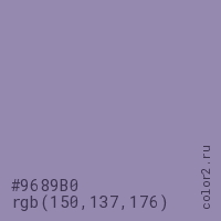Цвет #9689B0 в цветовой модели RGB обозначается тремя октетами (150, 137, 176) в десятичном формате и #9689B0 в шестнадцатиричном (hex) формате, которые являются интенсивностью красного 150 (hex 96), интенсивность зелёного 137 (hex 89) и интенсивность синего 176 (hex B0).