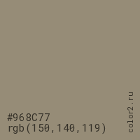 Цвет #968C77 в цветовой модели RGB обозначается тремя октетами (150, 140, 119) в десятичном формате и #968C77 в шестнадцатиричном (hex) формате, которые являются интенсивностью красного 150 (hex 96), интенсивность зелёного 140 (hex 8C) и интенсивность синего 119 (hex 77).