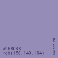 Цвет #968CB8 в цветовой модели RGB обозначается тремя октетами (150, 140, 184) в десятичном формате и #968CB8 в шестнадцатиричном (hex) формате, которые являются интенсивностью красного 150 (hex 96), интенсивность зелёного 140 (hex 8C) и интенсивность синего 184 (hex B8).