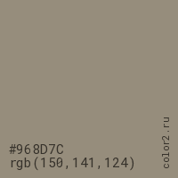 Цвет #968D7C в цветовой модели RGB обозначается тремя октетами (150, 141, 124) в десятичном формате и #968D7C в шестнадцатиричном (hex) формате, которые являются интенсивностью красного 150 (hex 96), интенсивность зелёного 141 (hex 8D) и интенсивность синего 124 (hex 7C).