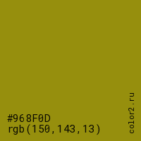 Цвет #968F0D в цветовой модели RGB обозначается тремя октетами (150, 143, 13) в десятичном формате и #968F0D в шестнадцатиричном (hex) формате, которые являются интенсивностью красного 150 (hex 96), интенсивность зелёного 143 (hex 8F) и интенсивность синего 13 (hex 0D).