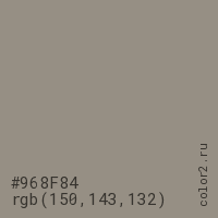 Цвет #968F84 в цветовой модели RGB обозначается тремя октетами (150, 143, 132) в десятичном формате и #968F84 в шестнадцатиричном (hex) формате, которые являются интенсивностью красного 150 (hex 96), интенсивность зелёного 143 (hex 8F) и интенсивность синего 132 (hex 84).