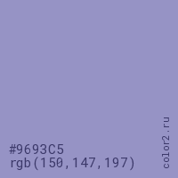 Цвет #9693C5 в цветовой модели RGB обозначается тремя октетами (150, 147, 197) в десятичном формате и #9693C5 в шестнадцатиричном (hex) формате, которые являются интенсивностью красного 150 (hex 96), интенсивность зелёного 147 (hex 93) и интенсивность синего 197 (hex C5).