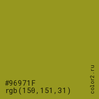 Цвет #96971F в цветовой модели RGB обозначается тремя октетами (150, 151, 31) в десятичном формате и #96971F в шестнадцатиричном (hex) формате, которые являются интенсивностью красного 150 (hex 96), интенсивность зелёного 151 (hex 97) и интенсивность синего 31 (hex 1F).