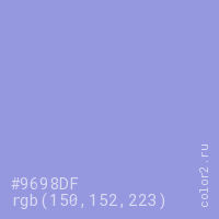 Цвет #9698DF в цветовой модели RGB обозначается тремя октетами (150, 152, 223) в десятичном формате и #9698DF в шестнадцатиричном (hex) формате, которые являются интенсивностью красного 150 (hex 96), интенсивность зелёного 152 (hex 98) и интенсивность синего 223 (hex DF).