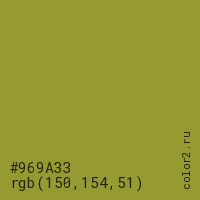 Цвет #969A33 в цветовой модели RGB обозначается тремя октетами (150, 154, 51) в десятичном формате и #969A33 в шестнадцатиричном (hex) формате, которые являются интенсивностью красного 150 (hex 96), интенсивность зелёного 154 (hex 9A) и интенсивность синего 51 (hex 33).