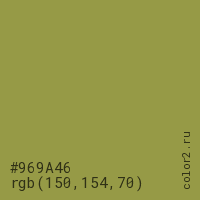 Цвет #969A46 в цветовой модели RGB обозначается тремя октетами (150, 154, 70) в десятичном формате и #969A46 в шестнадцатиричном (hex) формате, которые являются интенсивностью красного 150 (hex 96), интенсивность зелёного 154 (hex 9A) и интенсивность синего 70 (hex 46).
