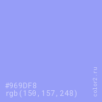 Цвет #969DF8 в цветовой модели RGB обозначается тремя октетами (150, 157, 248) в десятичном формате и #969DF8 в шестнадцатиричном (hex) формате, которые являются интенсивностью красного 150 (hex 96), интенсивность зелёного 157 (hex 9D) и интенсивность синего 248 (hex F8).