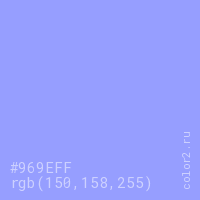 Цвет #969EFF в цветовой модели RGB обозначается тремя октетами (150, 158, 255) в десятичном формате и #969EFF в шестнадцатиричном (hex) формате, которые являются интенсивностью красного 150 (hex 96), интенсивность зелёного 158 (hex 9E) и интенсивность синего 255 (hex FF).