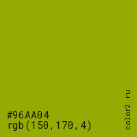 Цвет #96AA04 в цветовой модели RGB обозначается тремя октетами (150, 170, 4) в десятичном формате и #96AA04 в шестнадцатиричном (hex) формате, которые являются интенсивностью красного 150 (hex 96), интенсивность зелёного 170 (hex AA) и интенсивность синего 4 (hex 04).