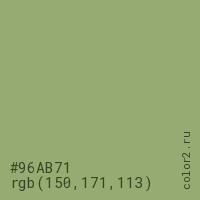 Цвет #96AB71 в цветовой модели RGB обозначается тремя октетами (150, 171, 113) в десятичном формате и #96AB71 в шестнадцатиричном (hex) формате, которые являются интенсивностью красного 150 (hex 96), интенсивность зелёного 171 (hex AB) и интенсивность синего 113 (hex 71).