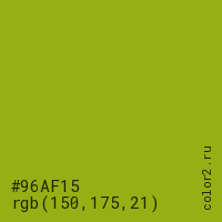 Цвет #96AF15 в цветовой модели RGB обозначается тремя октетами (150, 175, 21) в десятичном формате и #96AF15 в шестнадцатиричном (hex) формате, которые являются интенсивностью красного 150 (hex 96), интенсивность зелёного 175 (hex AF) и интенсивность синего 21 (hex 15).