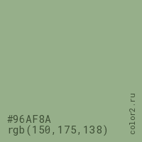 Цвет #96AF8A в цветовой модели RGB обозначается тремя октетами (150, 175, 138) в десятичном формате и #96AF8A в шестнадцатиричном (hex) формате, которые являются интенсивностью красного 150 (hex 96), интенсивность зелёного 175 (hex AF) и интенсивность синего 138 (hex 8A).