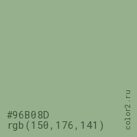 Цвет #96B08D в цветовой модели RGB обозначается тремя октетами (150, 176, 141) в десятичном формате и #96B08D в шестнадцатиричном (hex) формате, которые являются интенсивностью красного 150 (hex 96), интенсивность зелёного 176 (hex B0) и интенсивность синего 141 (hex 8D).
