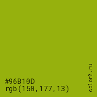 Цвет #96B10D в цветовой модели RGB обозначается тремя октетами (150, 177, 13) в десятичном формате и #96B10D в шестнадцатиричном (hex) формате, которые являются интенсивностью красного 150 (hex 96), интенсивность зелёного 177 (hex B1) и интенсивность синего 13 (hex 0D).