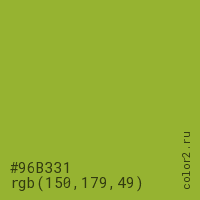 Цвет #96B331 в цветовой модели RGB обозначается тремя октетами (150, 179, 49) в десятичном формате и #96B331 в шестнадцатиричном (hex) формате, которые являются интенсивностью красного 150 (hex 96), интенсивность зелёного 179 (hex B3) и интенсивность синего 49 (hex 31).