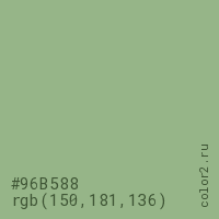 Цвет #96B588 в цветовой модели RGB обозначается тремя октетами (150, 181, 136) в десятичном формате и #96B588 в шестнадцатиричном (hex) формате, которые являются интенсивностью красного 150 (hex 96), интенсивность зелёного 181 (hex B5) и интенсивность синего 136 (hex 88).