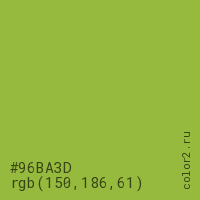 Цвет #96BA3D в цветовой модели RGB обозначается тремя октетами (150, 186, 61) в десятичном формате и #96BA3D в шестнадцатиричном (hex) формате, которые являются интенсивностью красного 150 (hex 96), интенсивность зелёного 186 (hex BA) и интенсивность синего 61 (hex 3D).