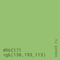 Цвет #96C171 в цветовой модели RGB обозначается тремя октетами (150, 193, 113) в десятичном формате и #96C171 в шестнадцатиричном (hex) формате, которые являются интенсивностью красного 150 (hex 96), интенсивность зелёного 193 (hex C1) и интенсивность синего 113 (hex 71).