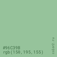 Цвет #96C39B в цветовой модели RGB обозначается тремя октетами (150, 195, 155) в десятичном формате и #96C39B в шестнадцатиричном (hex) формате, которые являются интенсивностью красного 150 (hex 96), интенсивность зелёного 195 (hex C3) и интенсивность синего 155 (hex 9B).