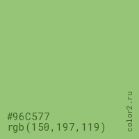 Цвет #96C577 в цветовой модели RGB обозначается тремя октетами (150, 197, 119) в десятичном формате и #96C577 в шестнадцатиричном (hex) формате, которые являются интенсивностью красного 150 (hex 96), интенсивность зелёного 197 (hex C5) и интенсивность синего 119 (hex 77).