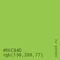 Цвет #96C84D в цветовой модели RGB обозначается тремя октетами (150, 200, 77) в десятичном формате и #96C84D в шестнадцатиричном (hex) формате, которые являются интенсивностью красного 150 (hex 96), интенсивность зелёного 200 (hex C8) и интенсивность синего 77 (hex 4D).