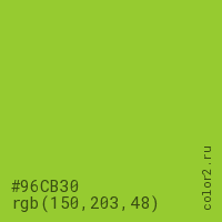 Цвет #96CB30 в цветовой модели RGB обозначается тремя октетами (150, 203, 48) в десятичном формате и #96CB30 в шестнадцатиричном (hex) формате, которые являются интенсивностью красного 150 (hex 96), интенсивность зелёного 203 (hex CB) и интенсивность синего 48 (hex 30).