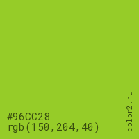 Цвет #96CC28 в цветовой модели RGB обозначается тремя октетами (150, 204, 40) в десятичном формате и #96CC28 в шестнадцатиричном (hex) формате, которые являются интенсивностью красного 150 (hex 96), интенсивность зелёного 204 (hex CC) и интенсивность синего 40 (hex 28).