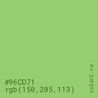 Цвет #96CD71 в цветовой модели RGB обозначается тремя октетами (150, 205, 113) в десятичном формате и #96CD71 в шестнадцатиричном (hex) формате, которые являются интенсивностью красного 150 (hex 96), интенсивность зелёного 205 (hex CD) и интенсивность синего 113 (hex 71).